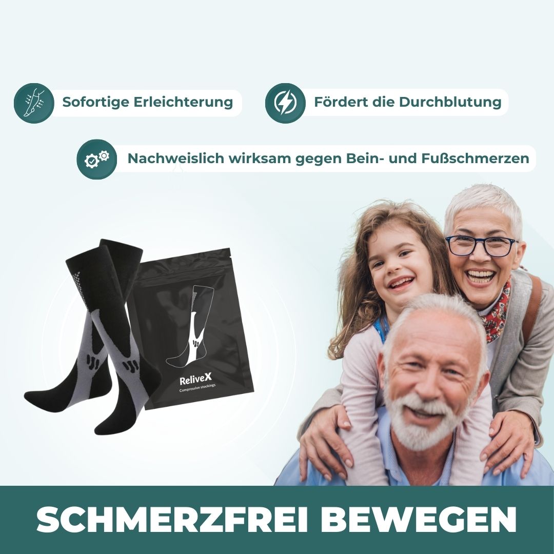Leiden Sie unter müden Beinen, Schwellungen oder Fußschmerzen? Entdecken Sie unsere neuen ReliveX Kompressionsstrümpfe! Diese Socken regen die Durchblutung an, reduzieren Schwellungen und lindern Schmerzen in Füßen und Beinen sofort. Perfekt für den Alltag – egal, ob Sie lange stehen, viel sitzen oder einfach nur zusätzlichen Komfort benötigen.